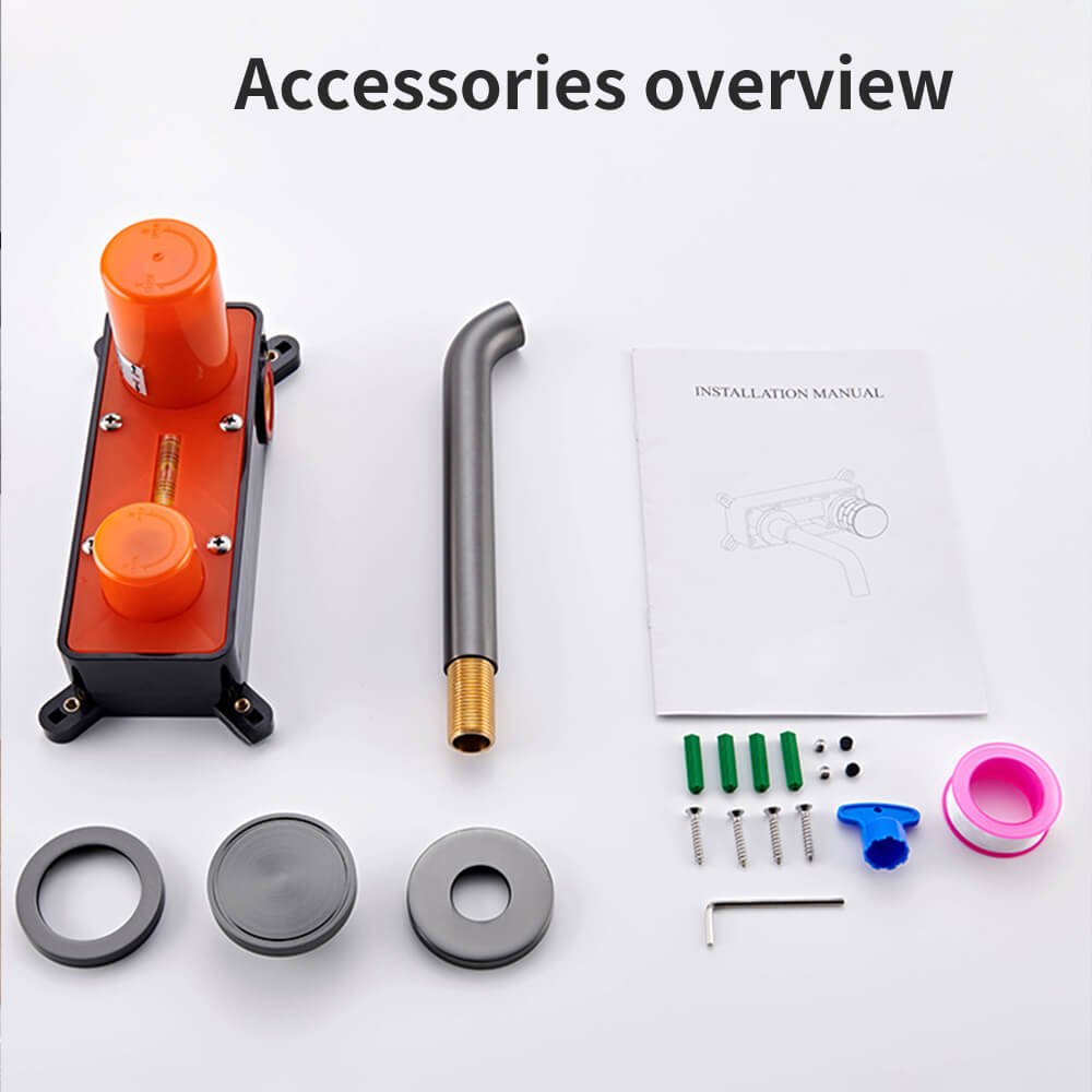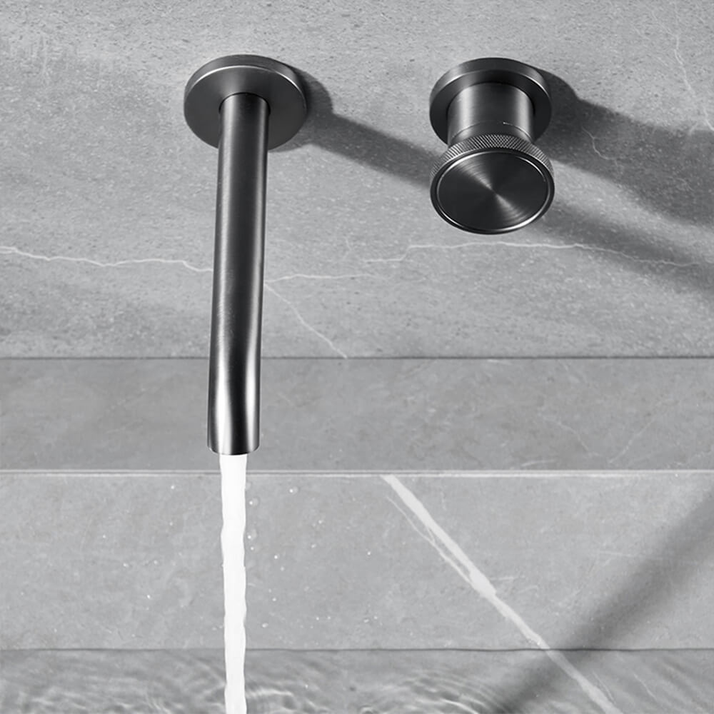- 【Industrial Design, Brushed Gunmetal Gray Finish】 Featuring a matte brushed gunmetal gray surface and a knurled control handle, this wall-mounted faucet delivers a bold industrial aesthetic with a modern, sophisticated edge—perfect for contemporary bathrooms.