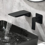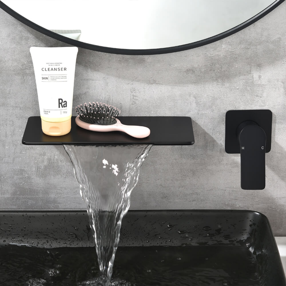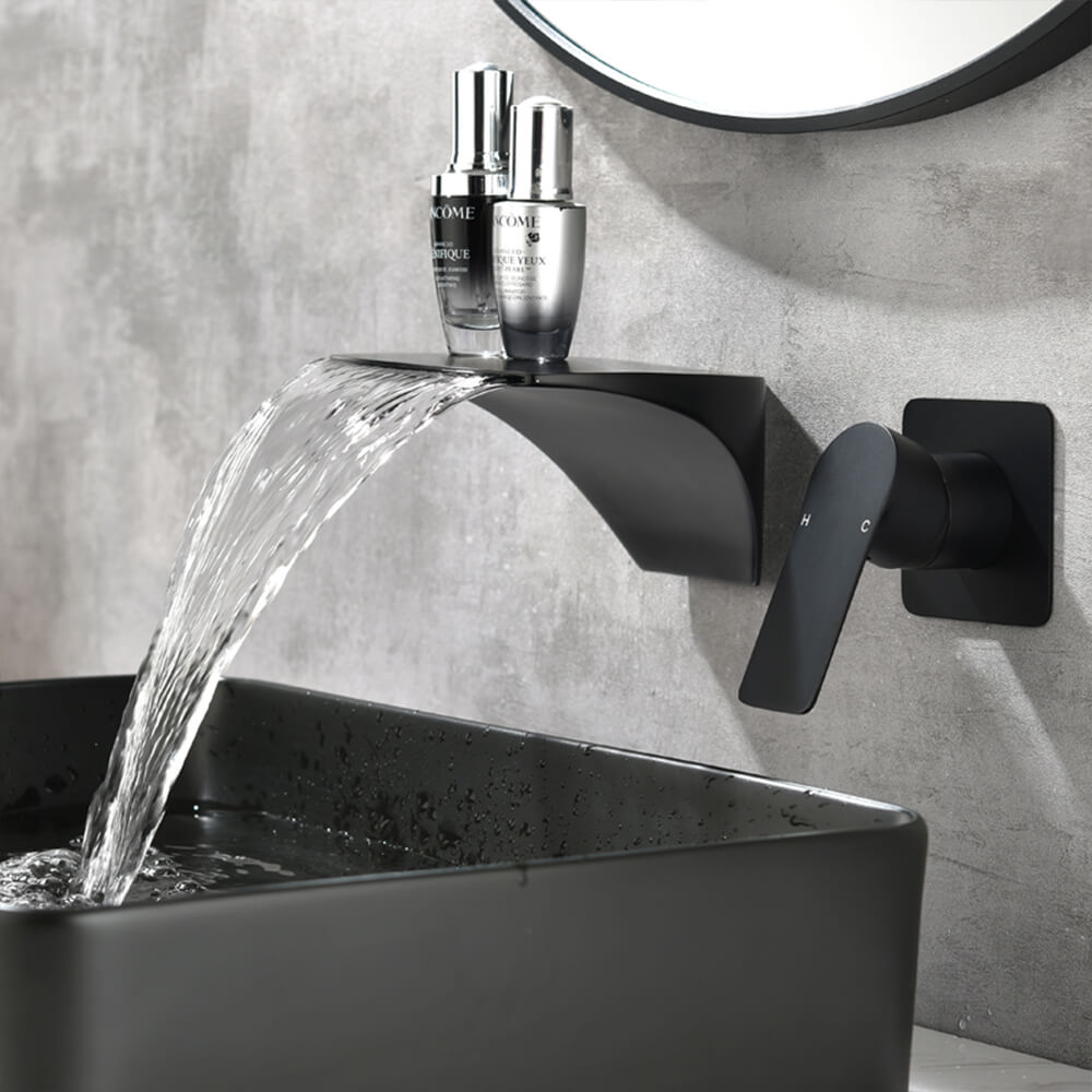 - INSPIRATION: This wall-mounted bathroom tap boasts a beautiful and unique design, as well as a smooth and delicate texture.The waterfall-style outlet has its own switch. This creates a quiet, warm atmosphere, and the single hole bathroom faucet offers a different visual effect.
