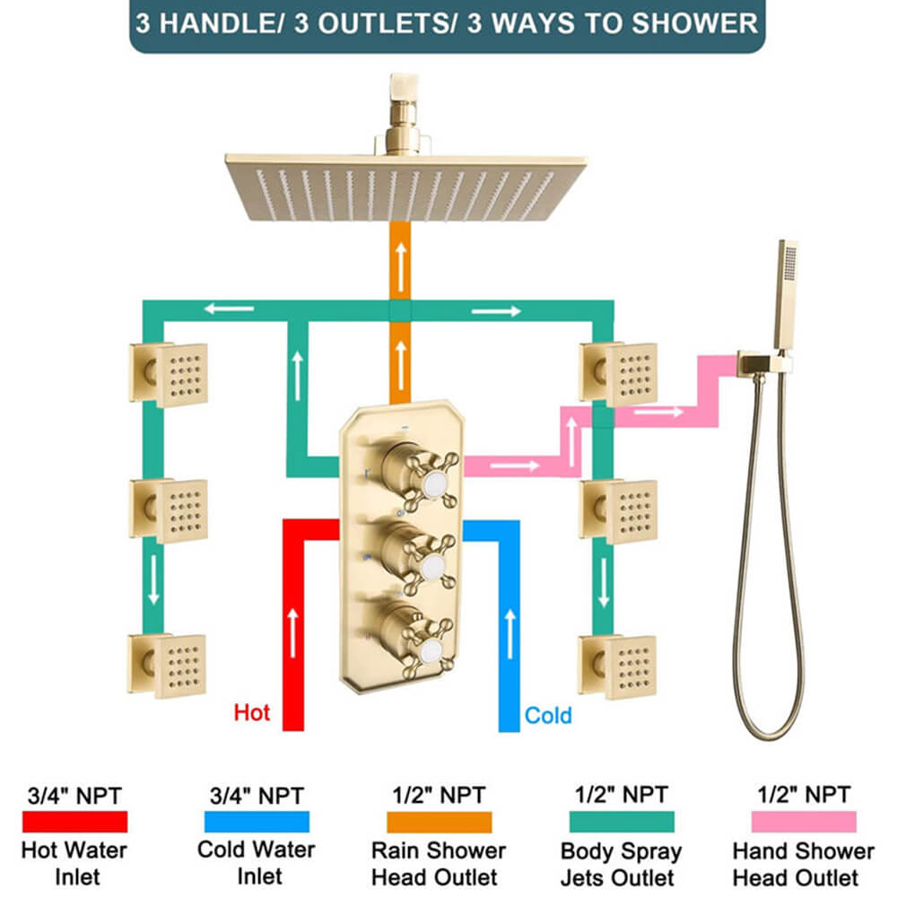DESIGNATED USAGE FOR 2 DEVICES: When using 2 showering devices, designated outlet 3 of the shower mixing valve must be CAPPED (Caps sold separately)